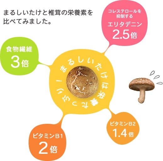 また、血液中のコレステロールを抑制するエリタデニン。椎茸に多量に含まれるこの成分が、まるしいたけには2.5倍も含まれているので、生活習慣病予防にも適した健康食材といえます。※2